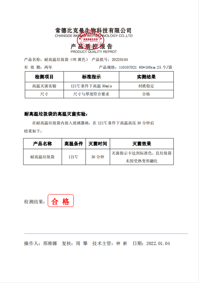 耐高温垃圾袋 黄色 80x100cm (PE复合膜材质) 25个袋 110107021 20220104