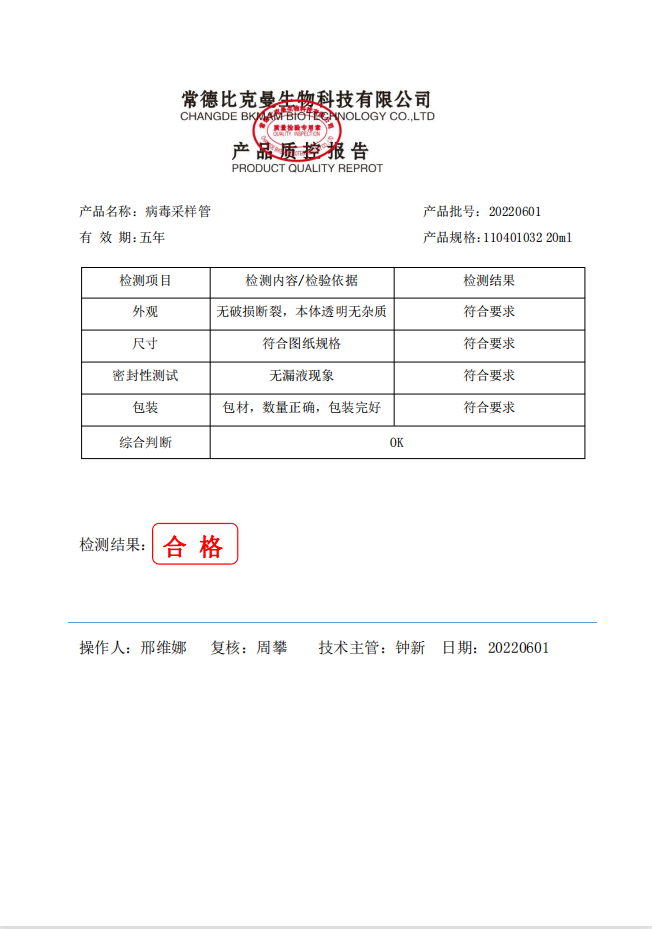 比克曼生物 病毒采样管 20ml 110401032 20220601