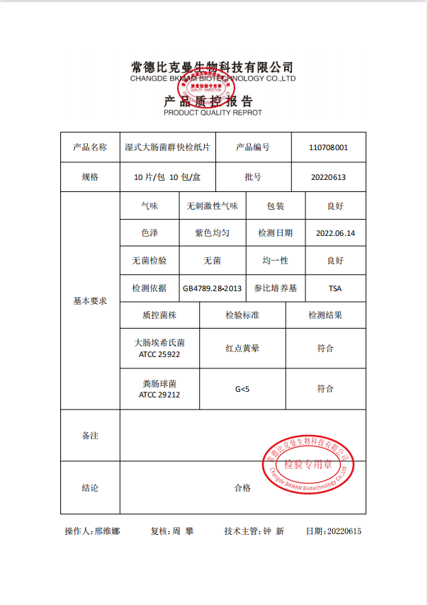比克曼生物 湿式大肠菌群快检纸片 20220613