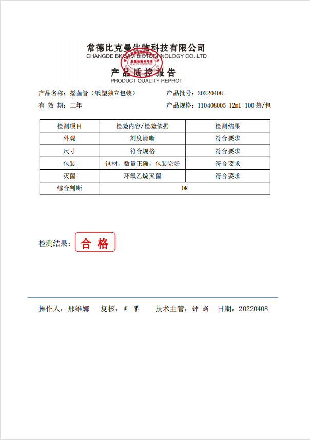 比克曼生物 摇菌管(12ml 纸塑独立包装)1个袋 100袋包 110408005 20220408