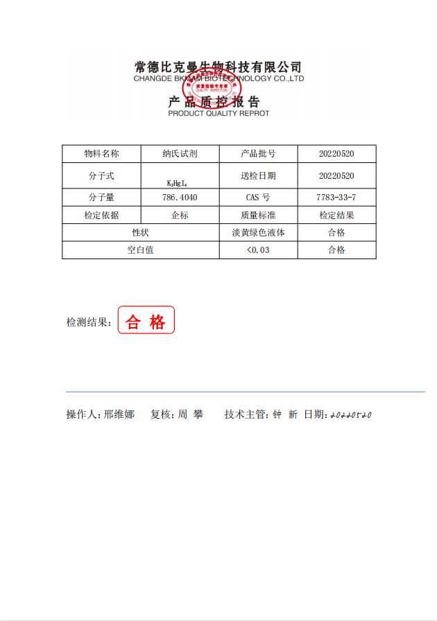 比克曼生物 纳氏试剂 500ml 瓶 110702071 20220520