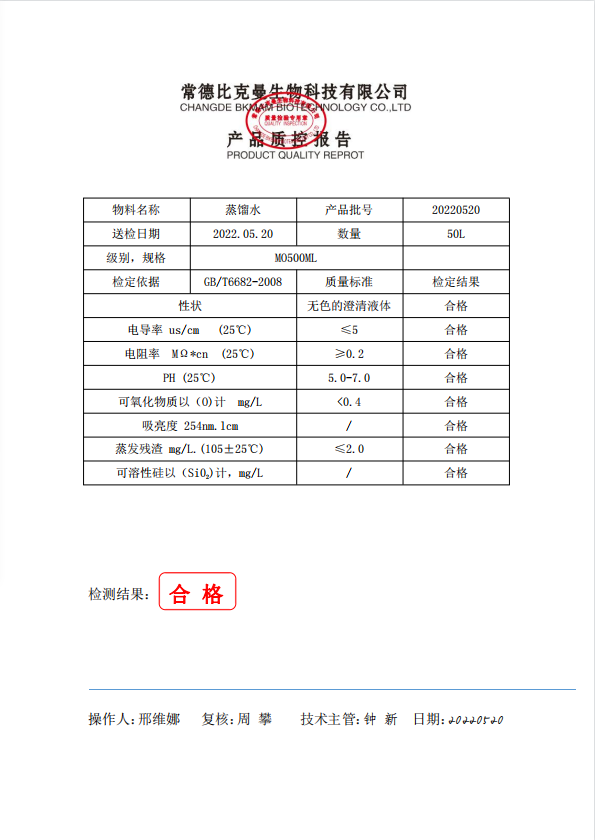 比克曼生物 蒸馏水 500ml 瓶 110702069 20220520