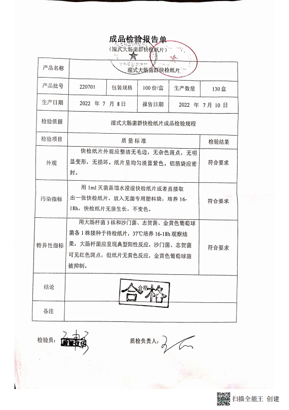 康华 湿式大肠菌群快检纸片 100份盒 160711012 220701