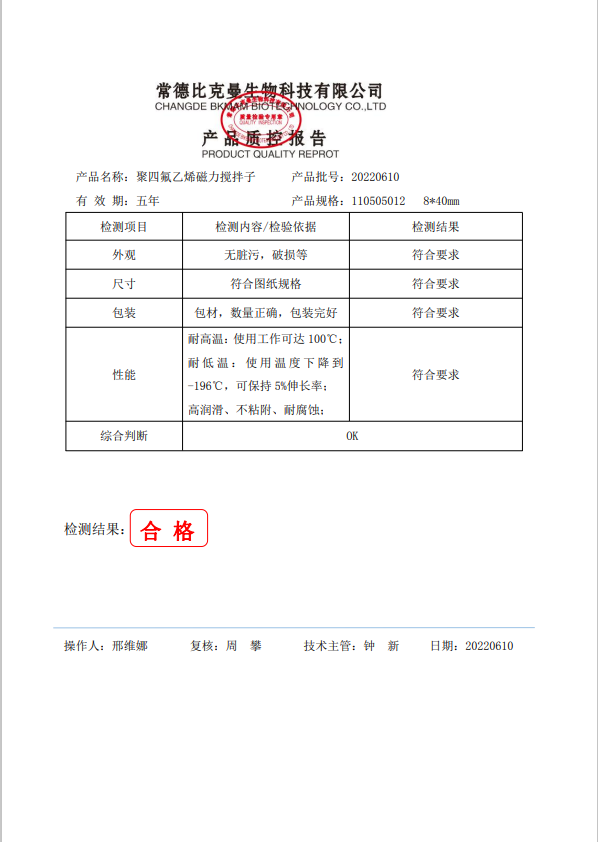 比克曼生物 聚四氟乙 烯磁力搅拌子 C型 8x40mm 110505012 20220610