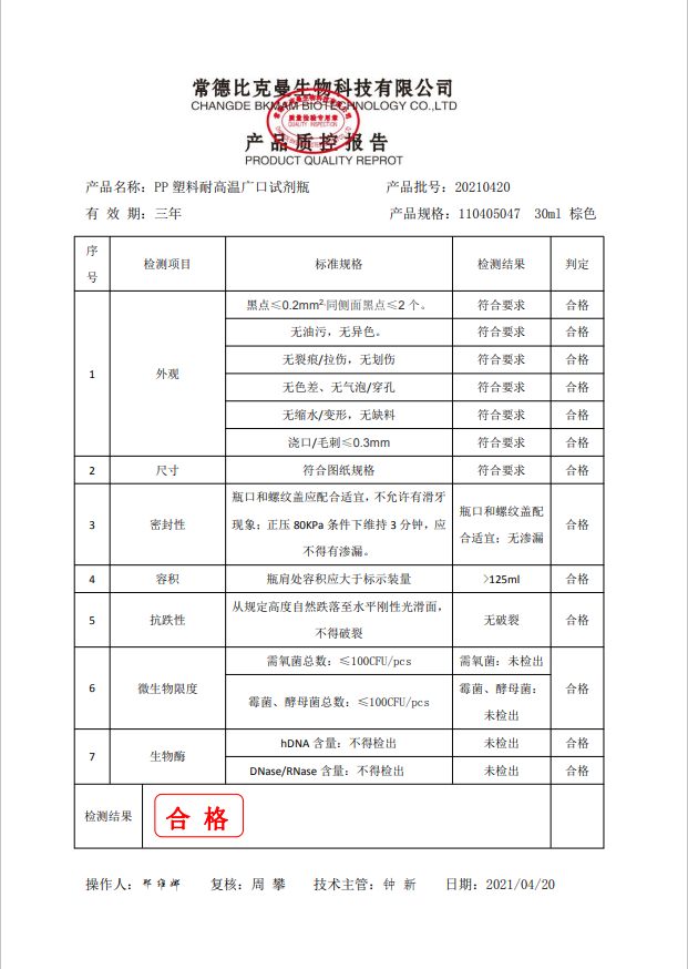 比克曼生物 PP塑料耐高温广口试剂瓶 30ml 棕色 110405047 20210420