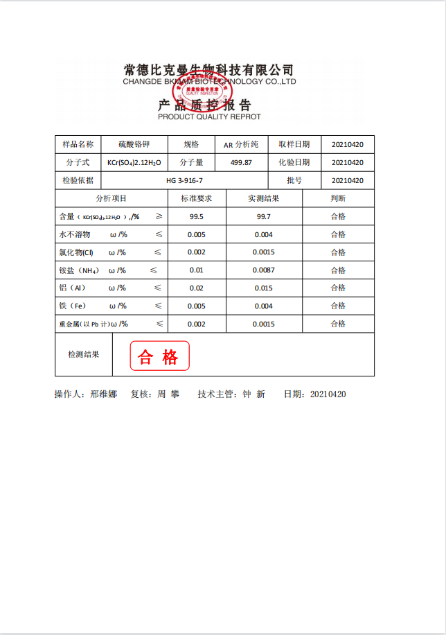 比克曼生物 硫酸铬钾 AR分析纯 500g瓶 110702024 20210420
