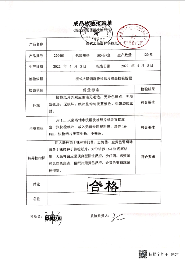 康华 湿式大肠菌群快检纸片 100份盒 160711012 220401