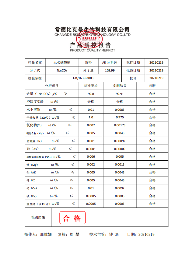 比克曼生物 无水碳酸钠 AR分析纯 500g瓶 110702055 20210219