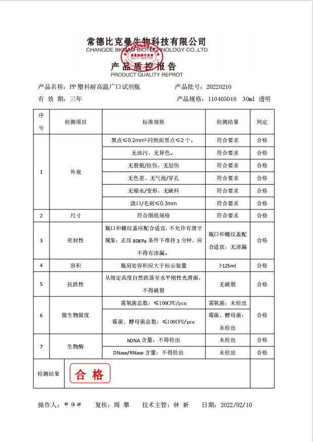 比克曼生物 PP塑料耐高温广口试剂瓶 30ml 110405048 20220210