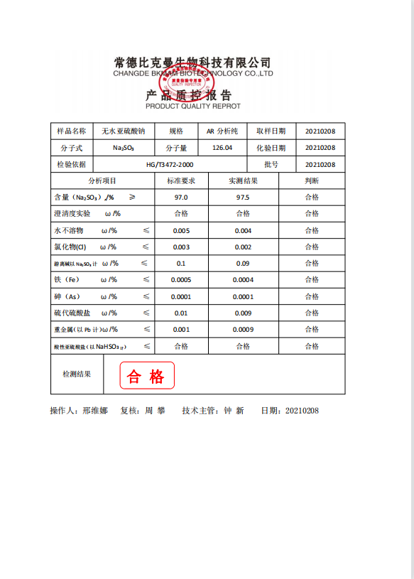 比克曼生物 无水亚硫酸钠 AR 分析纯 500g瓶 110702056 20210208