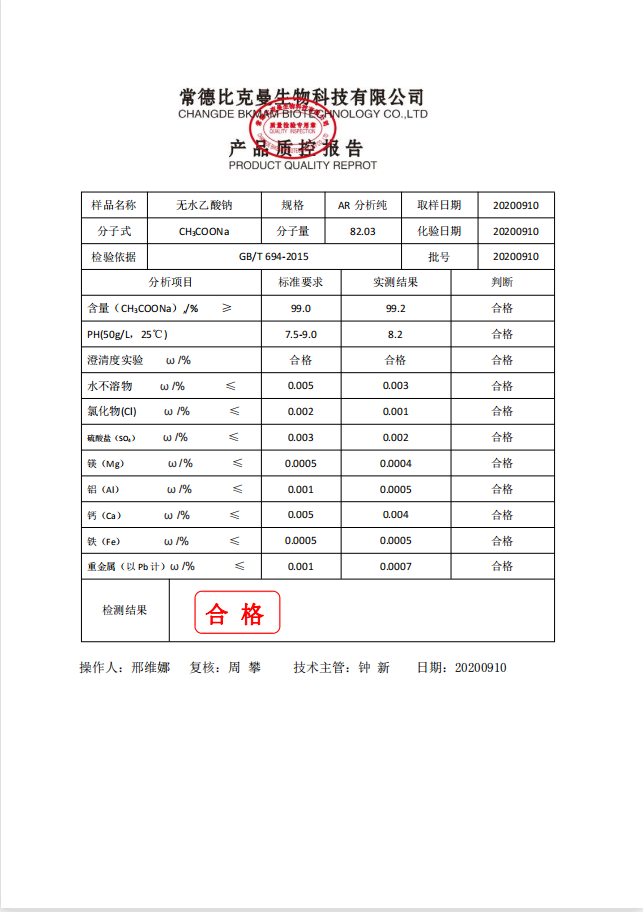 比克曼生物 无水乙酸钠 AR分析纯 250g瓶 110702057 20200910