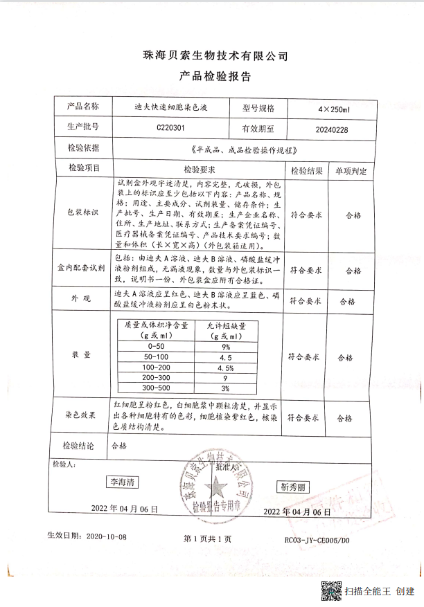 贝索 迪夫快速细胞染色液 250mlx4 BA4100 C220301