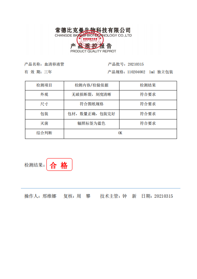 比克曼生物血清移液管 (独立装) 1ml 50支袋 110204002 20210315