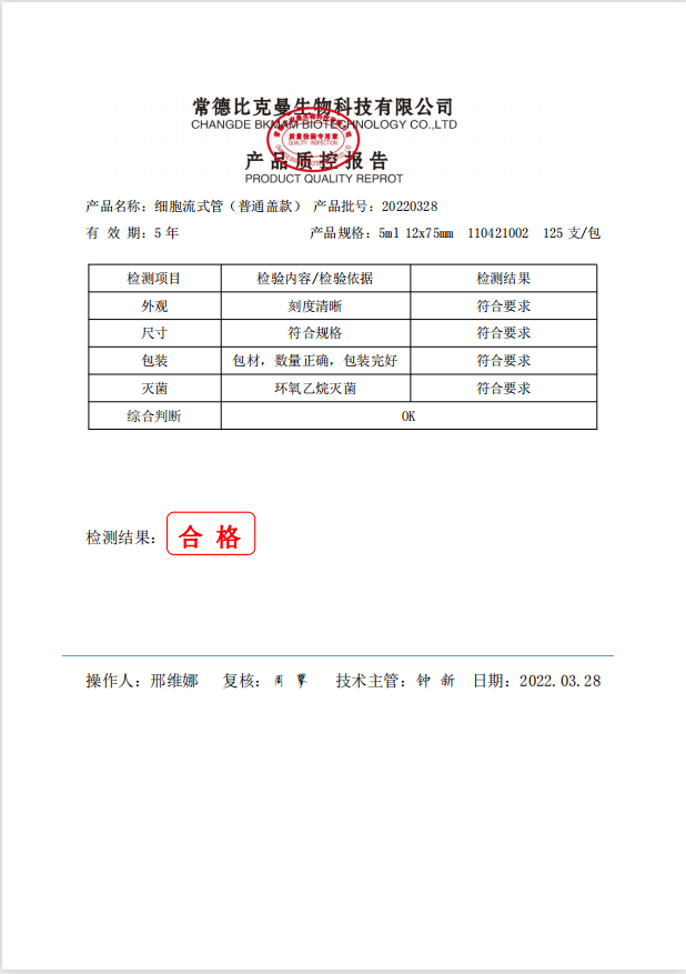 比克曼生物 细胞流式管(普通盖款) 5ml 12x75mm 125支袋 110421002 20220328