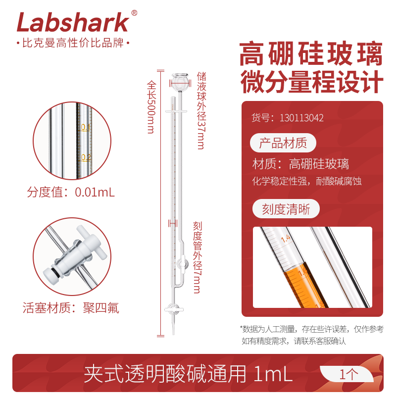 【夹式】透明 玻璃活塞1mL 分度0.01mL 1支/盒 130113037