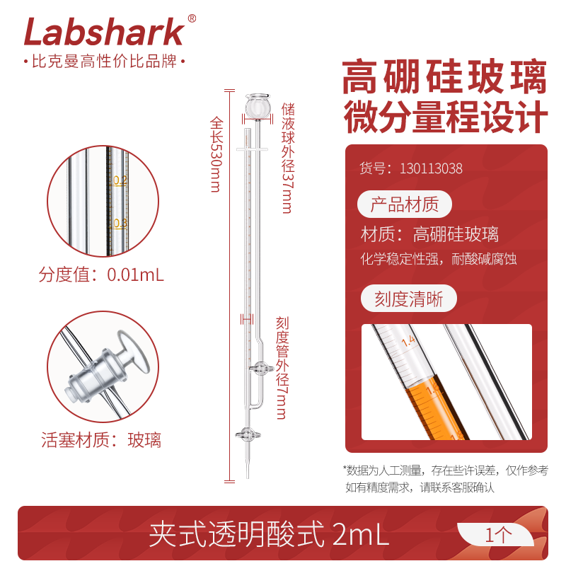 【夹式】透明 玻璃活塞2mL 分度0.01mL 1支/盒 130113038