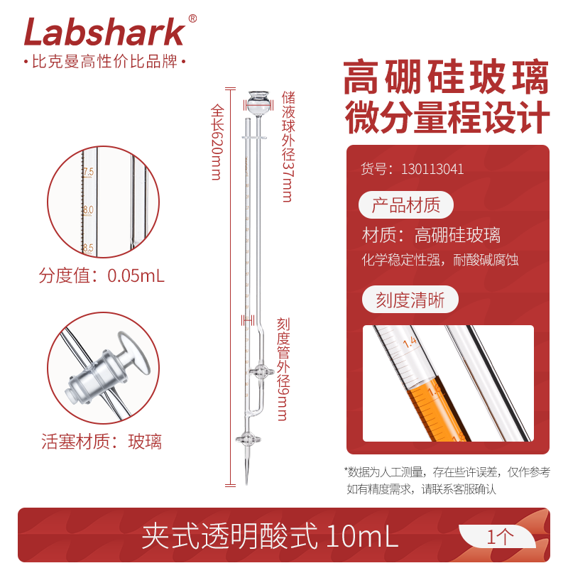 【夹式】透明 玻璃活塞10mL 分度0.05mL 1支/盒 130113041