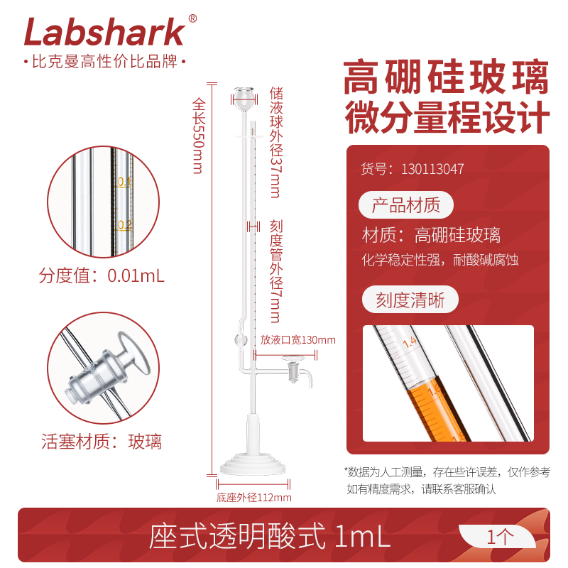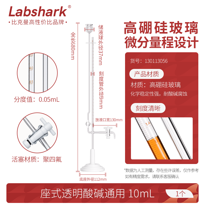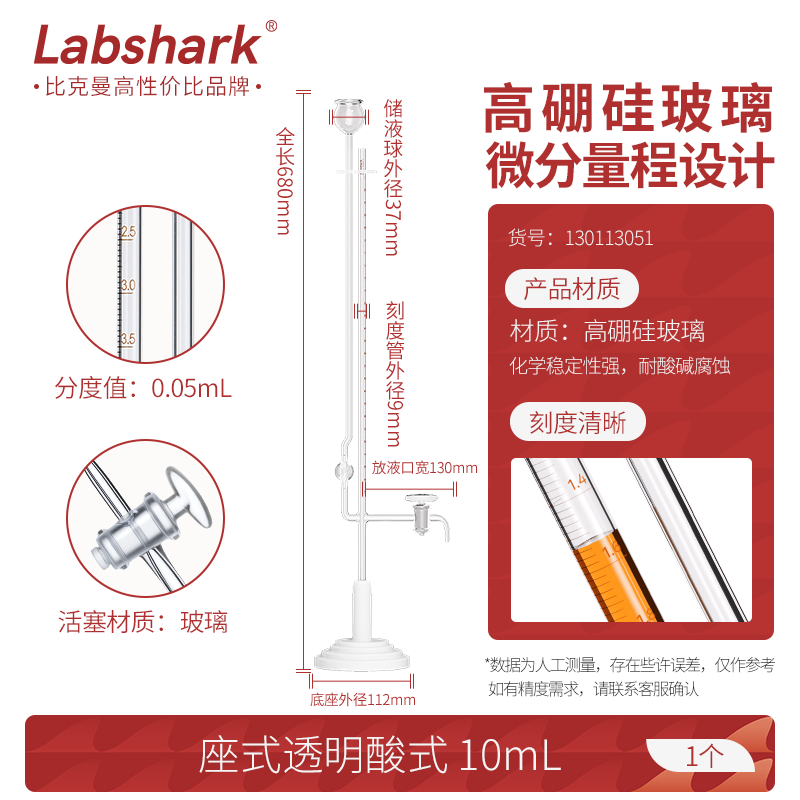 【座式】透明 玻璃活塞10mL 分度0.05mL 1支/盒 130113051