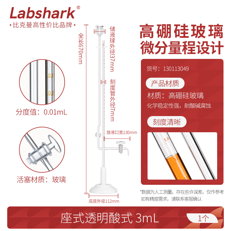 【座式】透明 玻璃活塞3mL 分度0.01mL 1支/盒 130113049