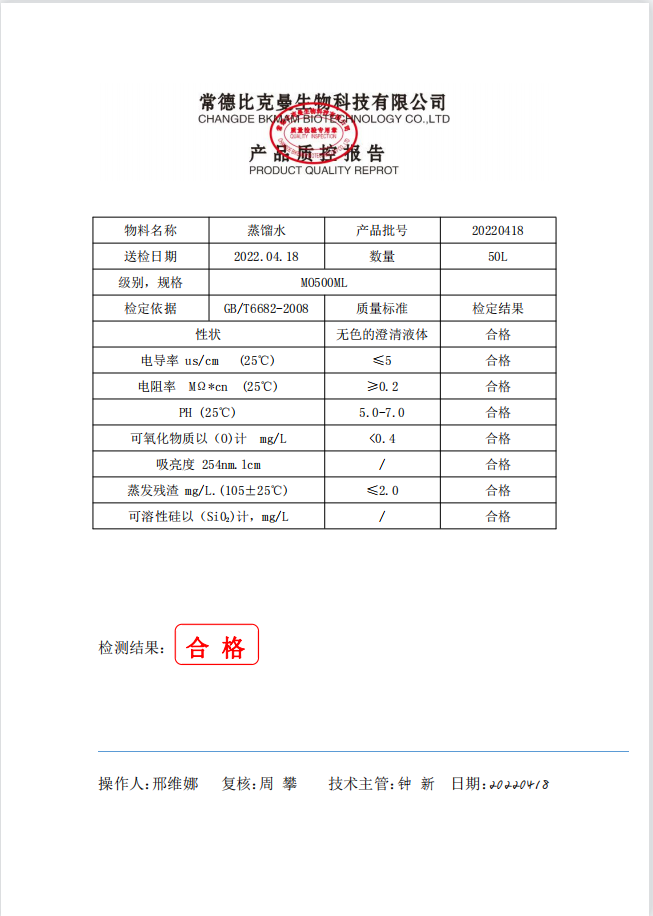 比克曼生物 蒸馏水 500ml 瓶 110702069 20220418
