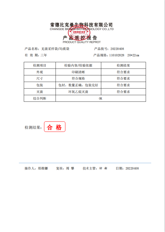 立式无菌采样袋 20x22(带压条) 100个装 110102028 20220408